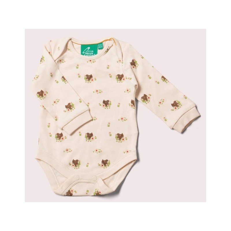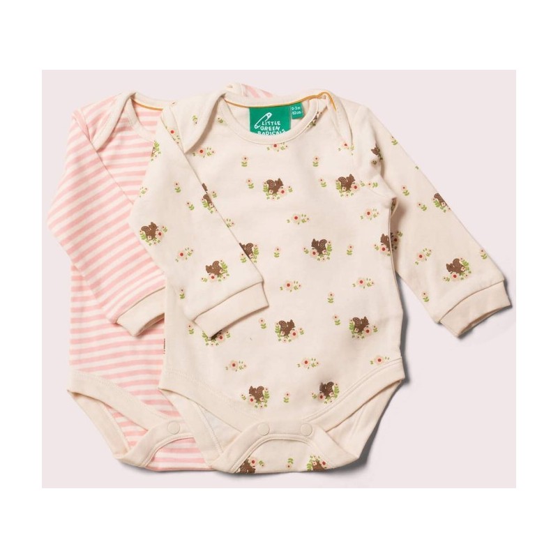 Weiche Baby Bodys im Doppelpack von Little Green Radicals mit Eichhörnchen-Allover und Streifen.