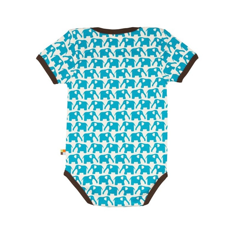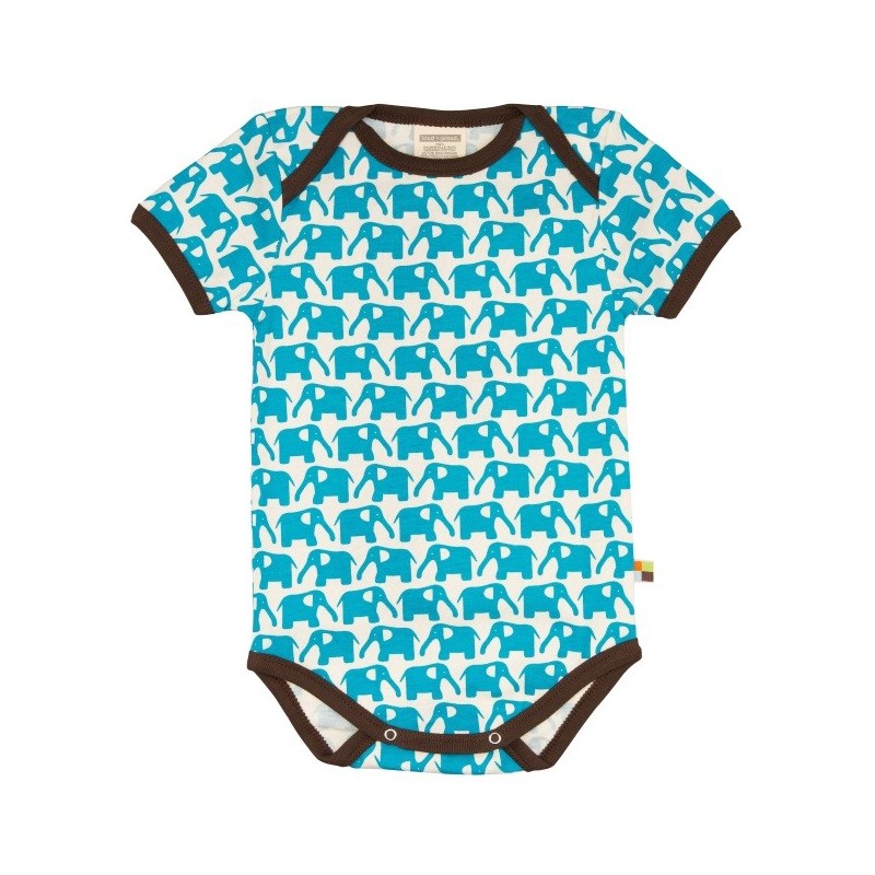 Der Body ist mit einem lustigen Elefanten-Allover verziert und die Kanten sind mit einem kontrastfarbigen Einfassband abgesetzt.