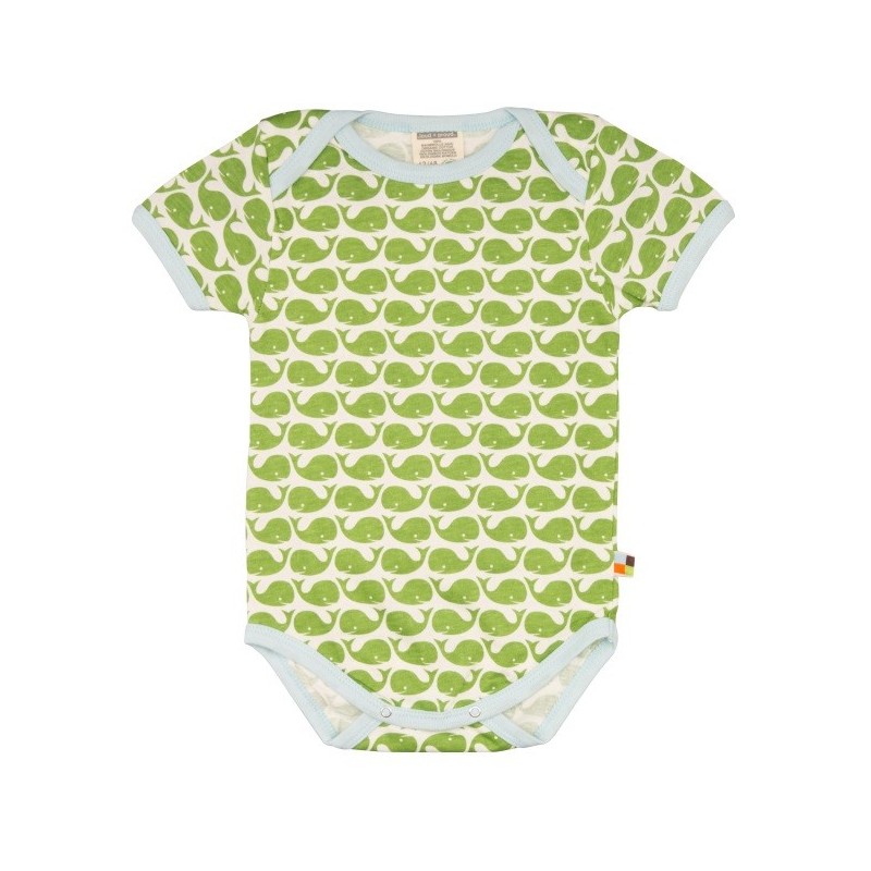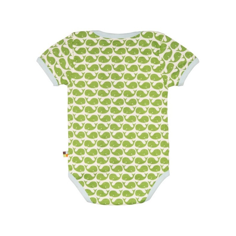 Der Body ist mit einem lustigen Wal-Allover verziert und die Kanten sind mit einem kontrastfarbigen Einfassband abgesetzt.