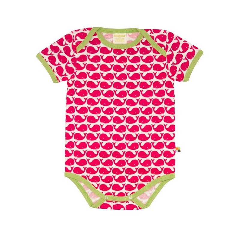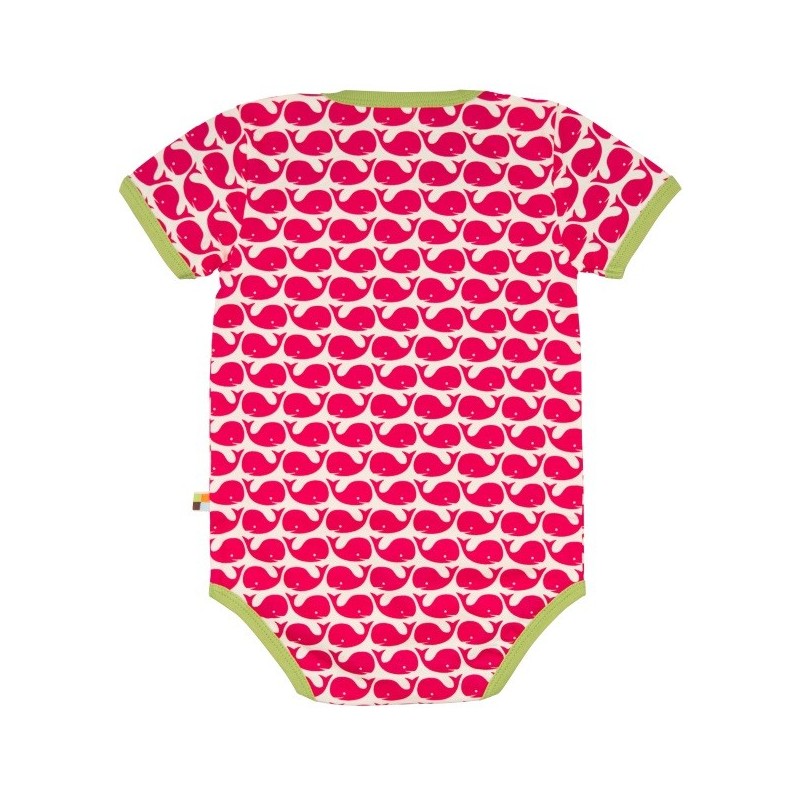 Der Body ist mit einem lustigen Wal-Allover verziert und die Kanten sind mit einem kontrastfarbigen Einfassband abgesetzt.