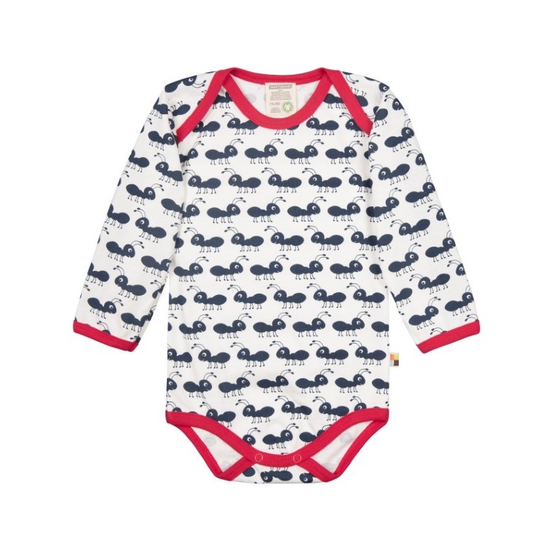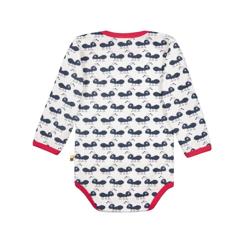 Der Body ist mit einem lustigen Ameisen-Allover verziert und die Kanten sind mit einem kontrastfarbigen Einfassband abgesetzt.
