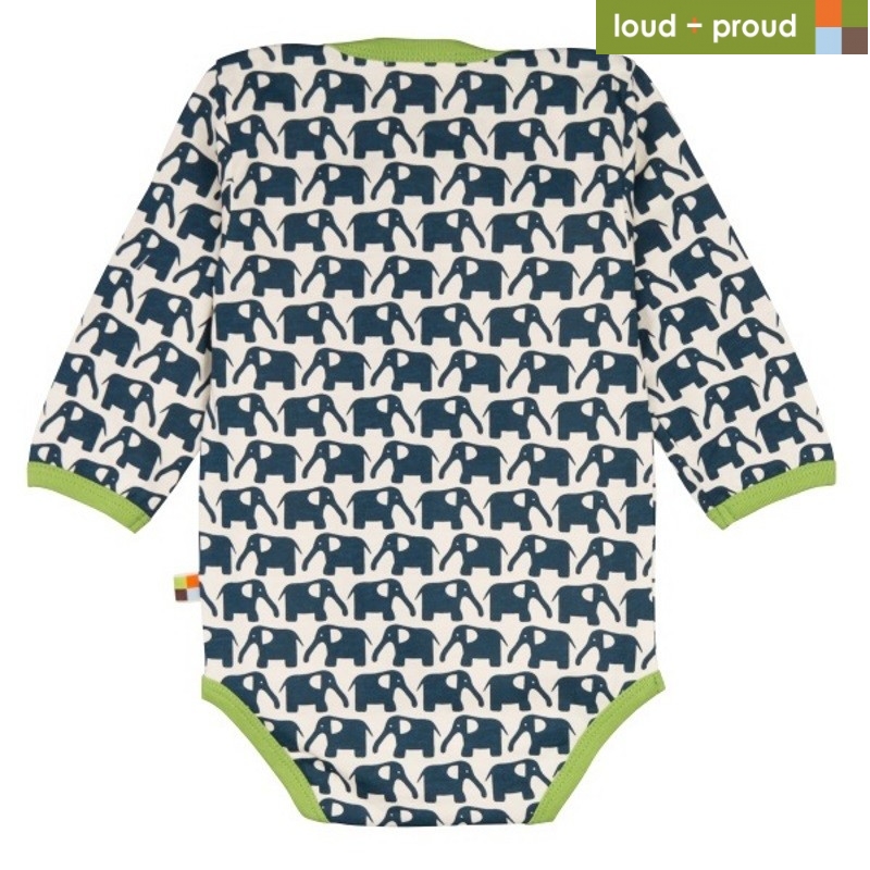 Der Body ist mit einem lustigen Elefanten-Allover verziert und die Kanten sind mit einem kontrastfarbigen Einfassband abgesetzt.