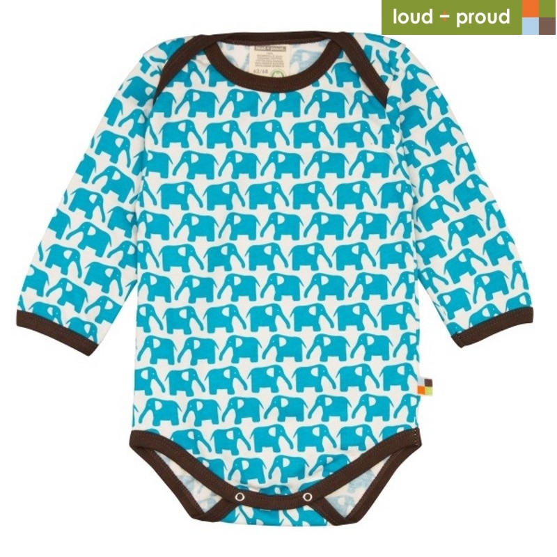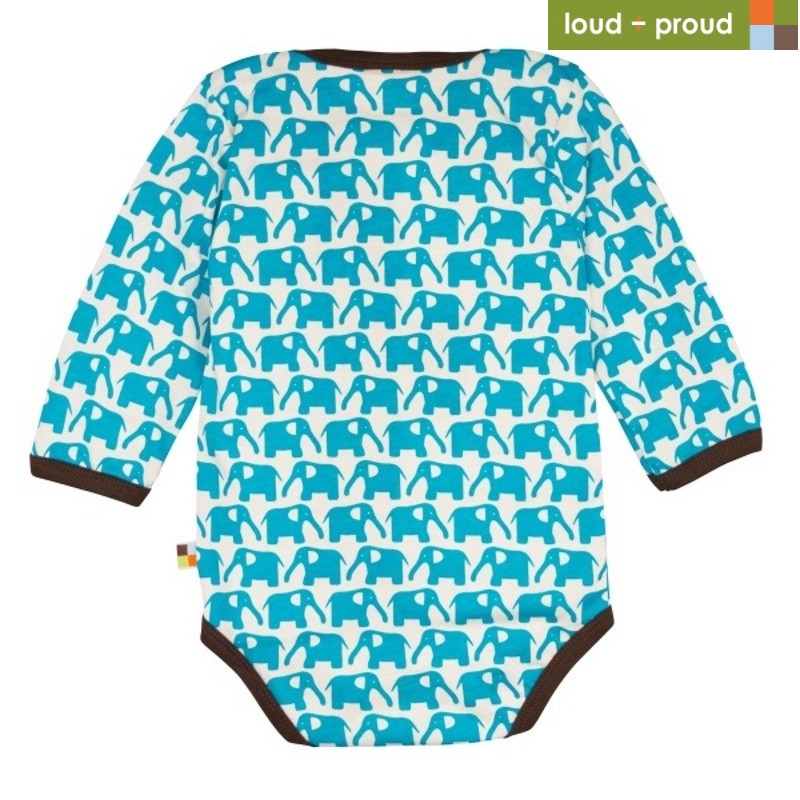 Der Body ist mit einem lustigen Elefanten-Allover verziert und die Kanten sind mit einem kontrastfarbigen Einfassband abgesetzt.