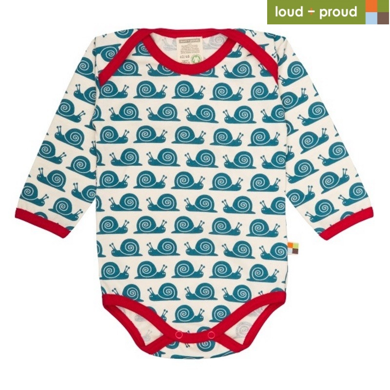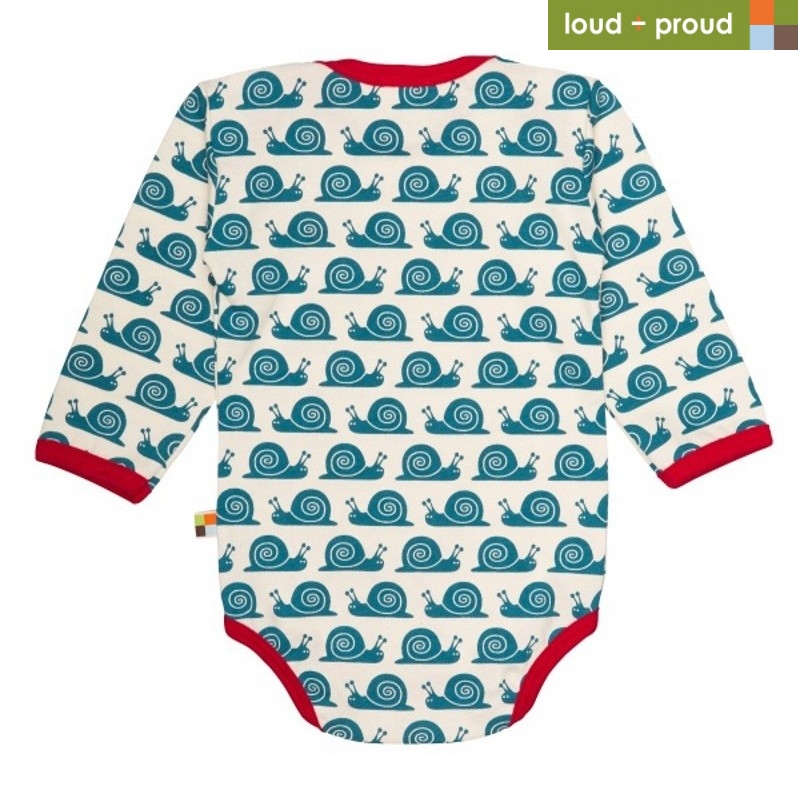 Der Body ist mit einem niedlichen Schnecken-Allover verziert und die Kanten sind mit einem kontrastfarbigen Einfassband abgesetzt.
