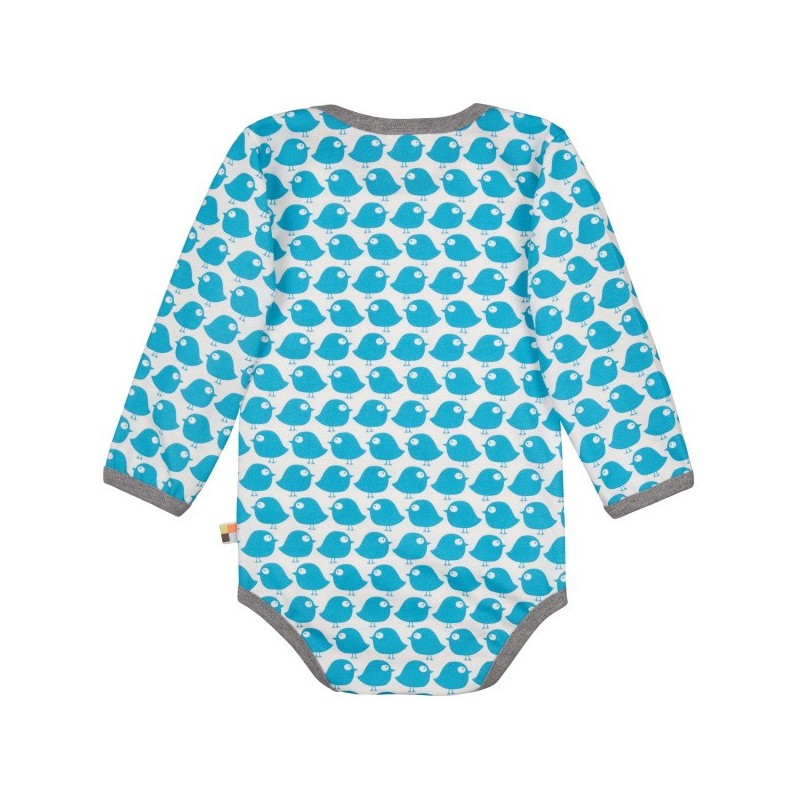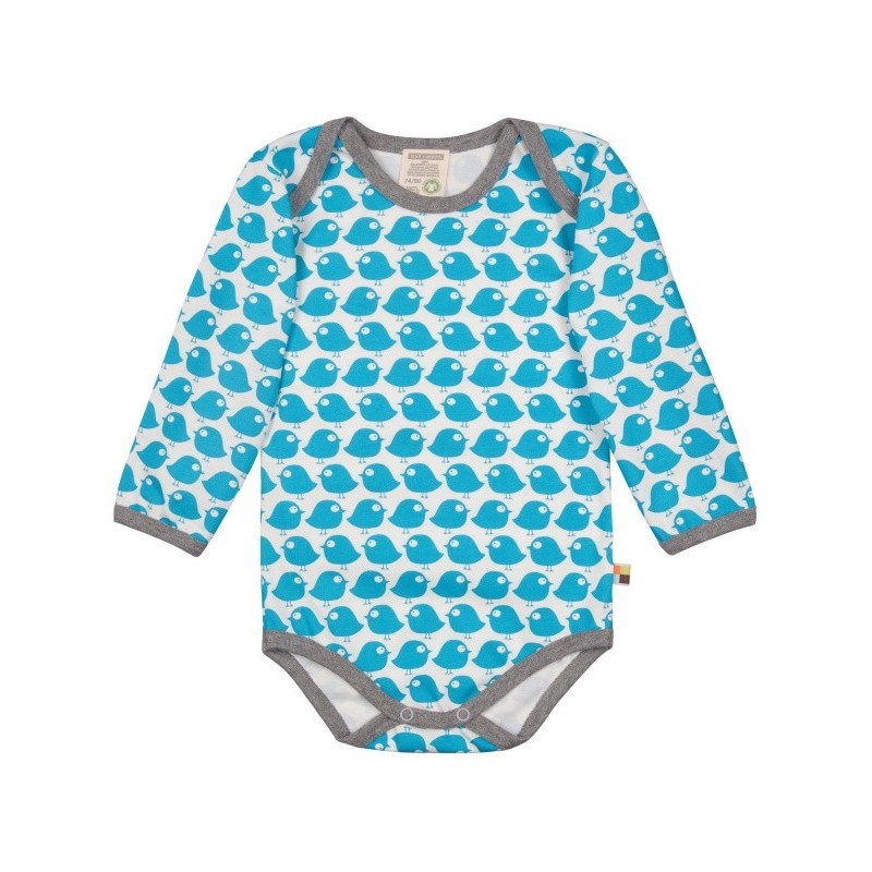 Der Body ist mit einem lustigen Vogel-Allover verziert und die Kanten sind mit einem kontrastfarbigen Einfassband abgesetzt.