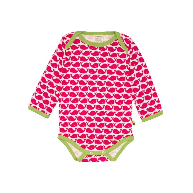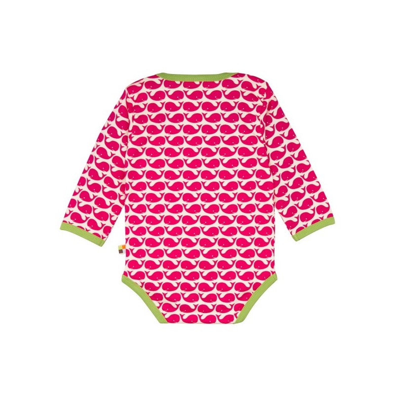 Der Body ist mit einem niedlichen Wal-Allover verziert und die Kanten sind mit einem kontrastfarbigen Einfassband abgesetzt.