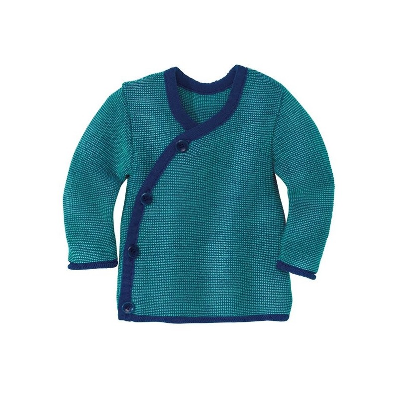 Wunderbar weiche Jacke aus feiner Merino-Schurwolle für die Kleinsten. Dank ihres Wickelverschlusses auf der Vorderseite, ist die Jacke auch am liegenden Kind ganz einfach anzuziehen. Steinnussknöpfe außen und ein Bindeband auf der Innenseite sorgen für sicheren Verschluss. So drückt auch bei Bauchlage, beim Robben und Spielen kein Knopf. Durch den weichen Links-Strick ist die Jacke besonders elastisch und macht jede Bewegung mit.