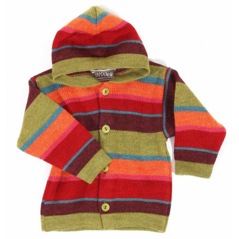 Süße bunte Jacke mit Kapuze und Holzknöpfen aus kbT Schurwolle in dickerer Qualität.
