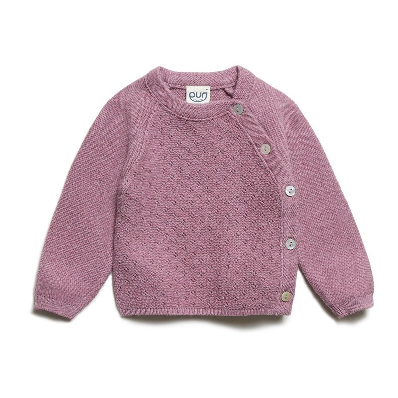 Feine, weiche Baby Strickjacke aus formstabilem Krausstrick. Einfach anzuziehen und mit Perlmuttknöpfen zu schließen.