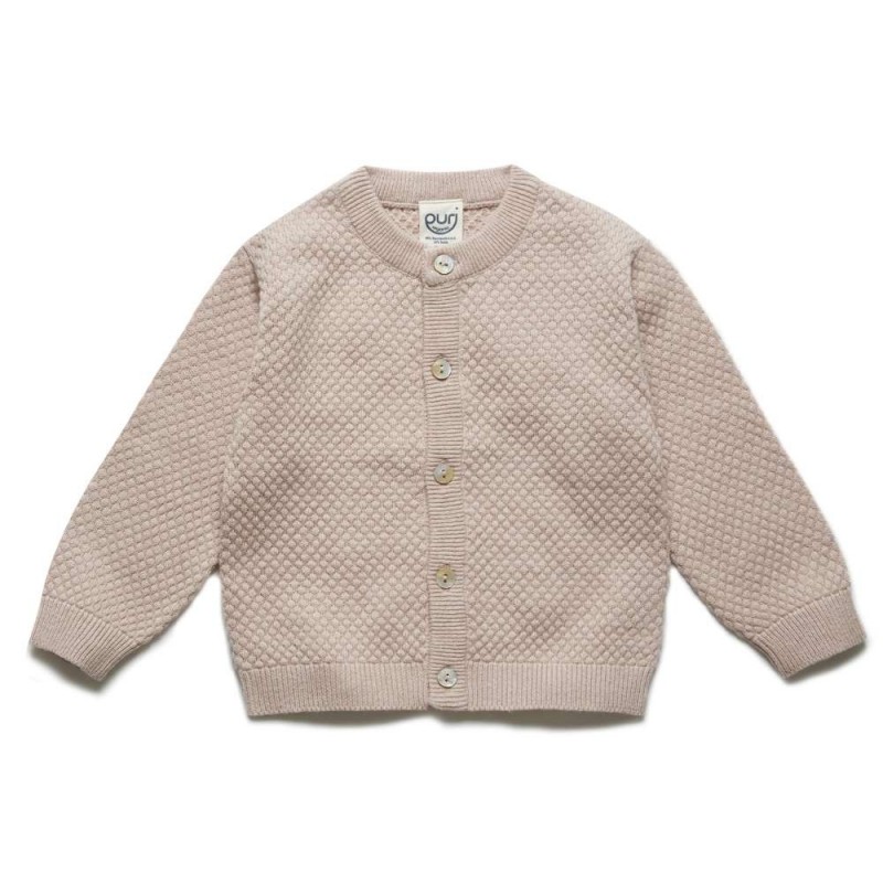 Weicher Baby Strickcardigan aus weichem, warmen und formstabilen Popcorn-Strick. Mit durchgehender Knopfleiste aus abgerundeten Perlmuttknöpfen.