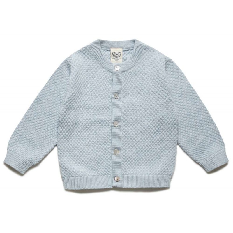 Weicher Baby Strickcardigan aus weichem, warmen und formstabilen Popcorn-Strick. Mit durchgehender Knopfleiste aus abgerundeten Perlmuttknöpfen.
