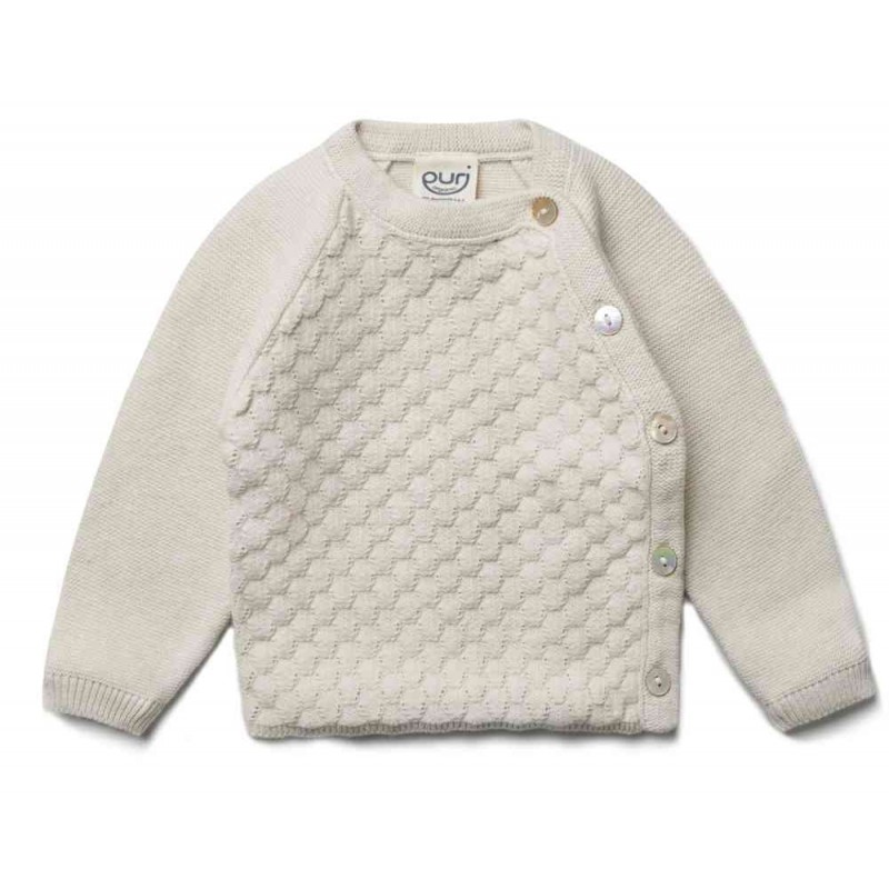 Weicher Baby Strickcardigan aus weichem, warmen und formstabilen Strukturstrick. Mit durchgehender Knopfleiste aus abgerundeten Perlmuttknöpfen.