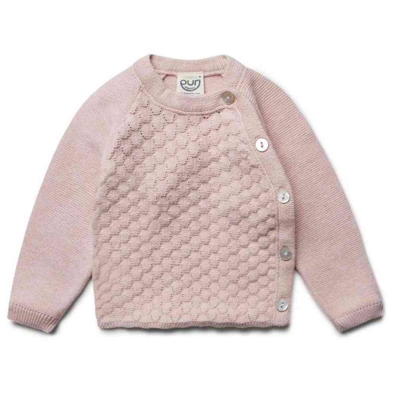 Weicher Baby Strickcardigan aus weichem, warmen und formstabilen Strukturstrick. Mit durchgehender Knopfleiste aus abgerundeten Perlmuttknöpfen.