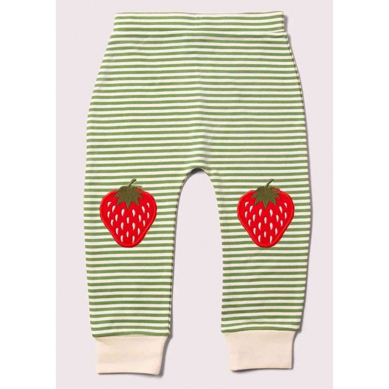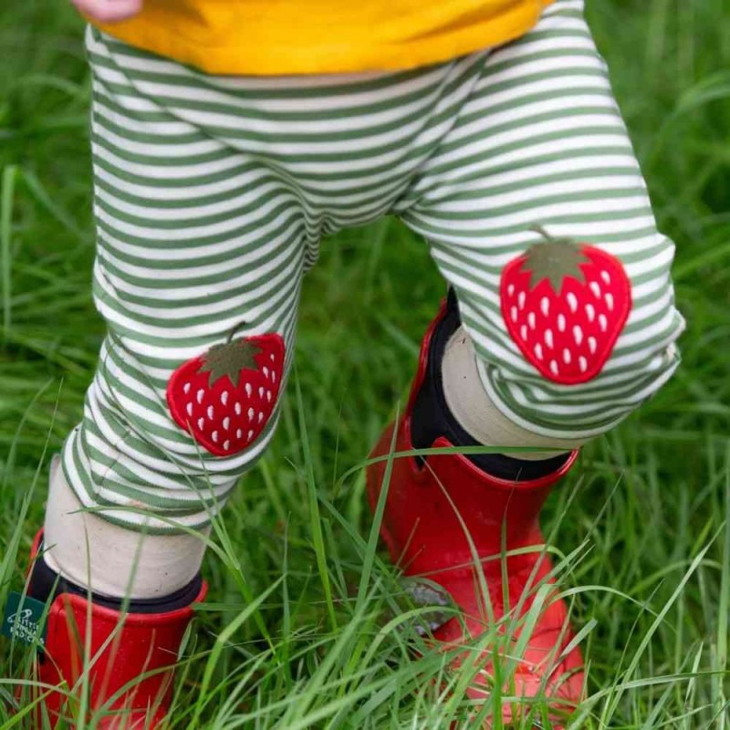 Leichte Jerseyhose von Little Green Radicals mit Erdbeer-Patches an den Knien.