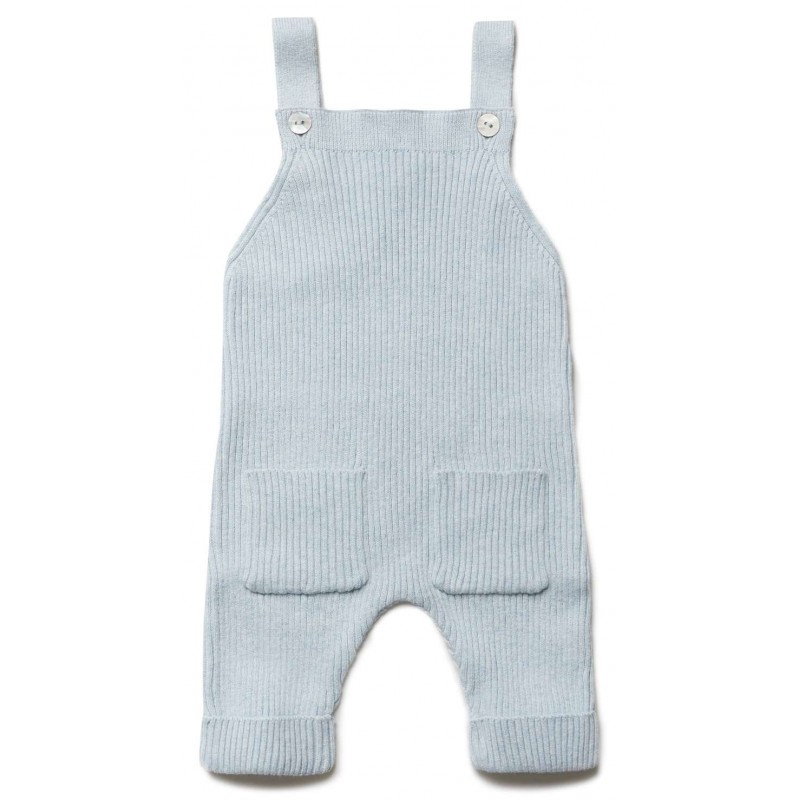 Feine, weiche Baby Stricklatzhose mit zwei aufgesetzten Taschen aus formstabilem Rippenstrick. Die Trägerlänge ist verstellbar mit Perlmuttknöpfen.