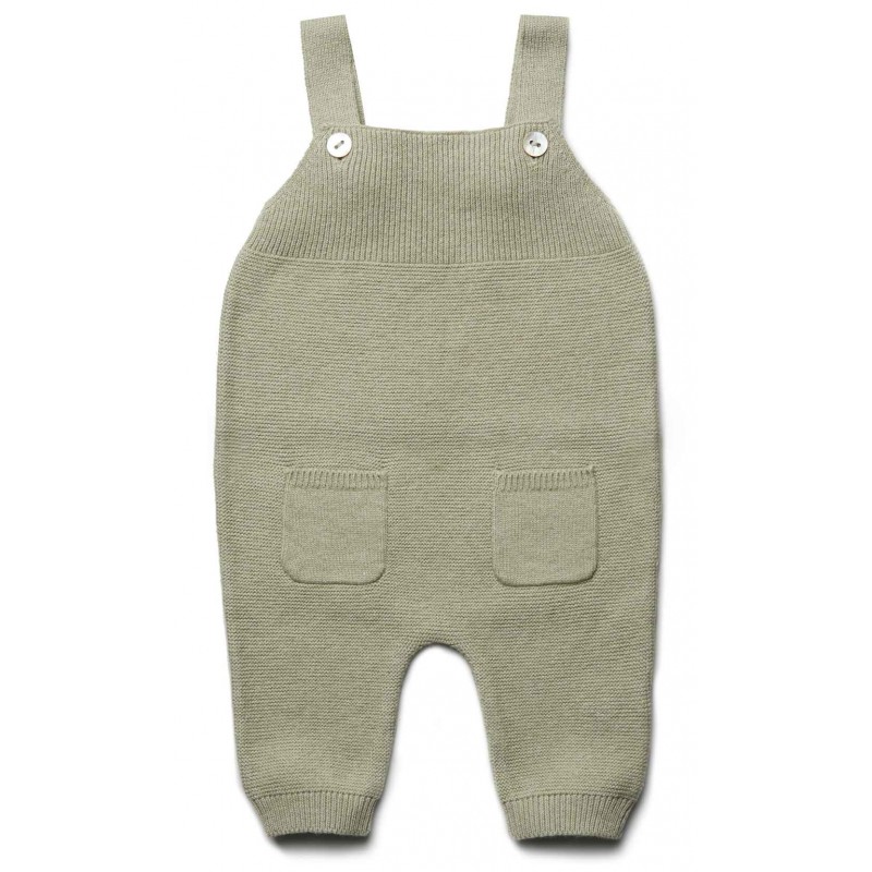 Feine, weiche Baby Stricklatzhose mit zwei aufgesetzten Taschen aus formstabilem Perlfangstrick. Die Trägerlänge ist verstellbar mit Perlmuttknöpfen.