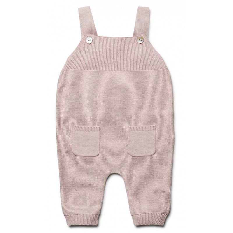 Feine, weiche Baby Stricklatzhose mit zwei aufgesetzten Taschen aus formstabilem Perlfangstrick. Die Trägerlänge ist verstellbar mit Perlmuttknöpfen.