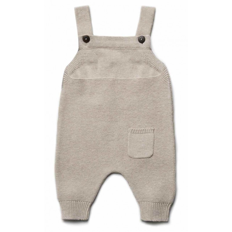 Feine, weiche Baby Stricklatzhose mit einer aufgesetzten Tasche aus formstabilem Perlfangstrick. Die Trägerlänge ist verstellbar mit Holzknöpfen.