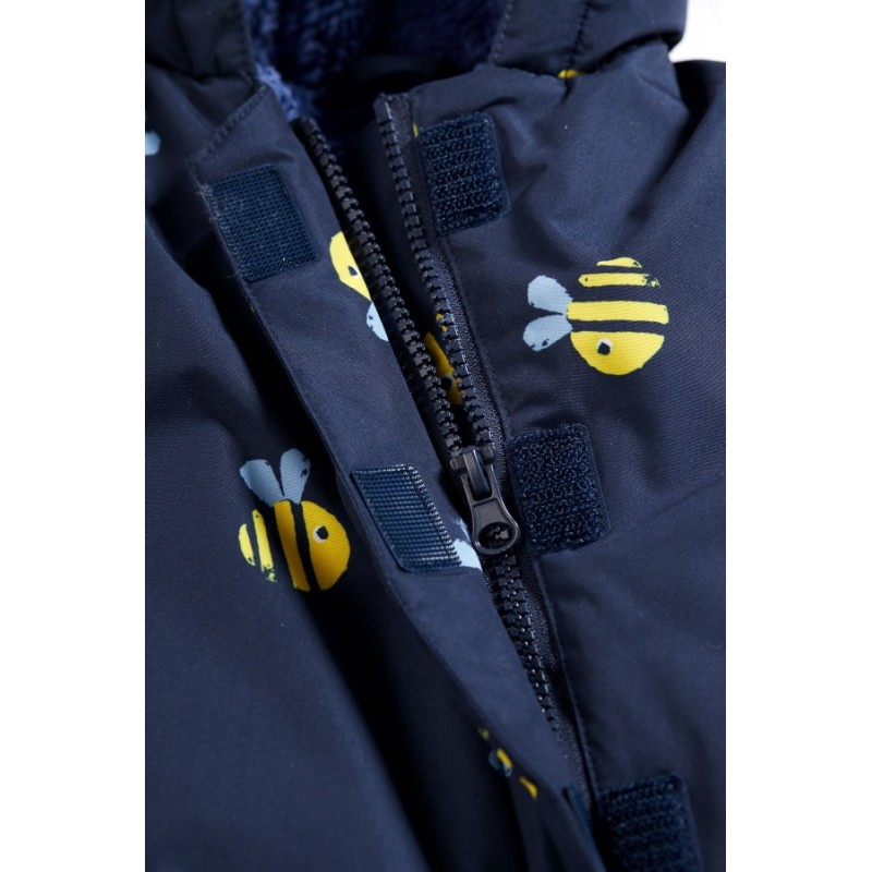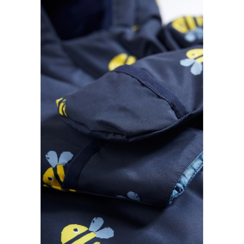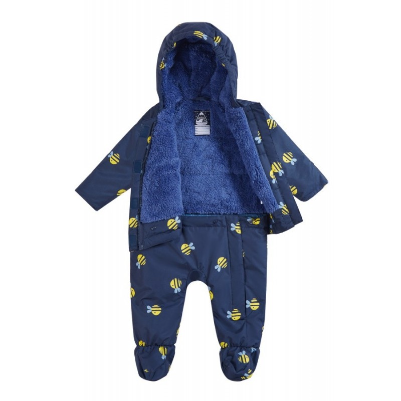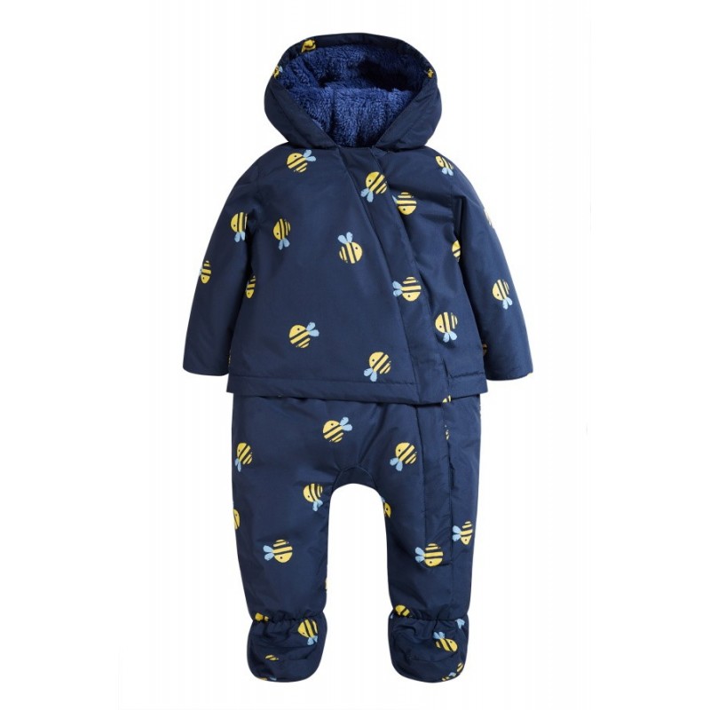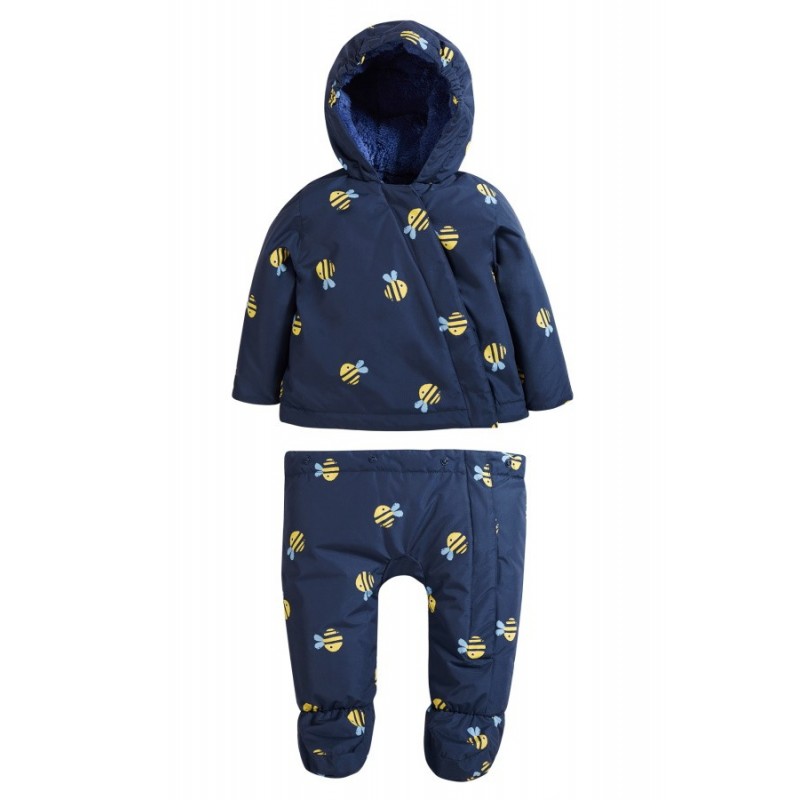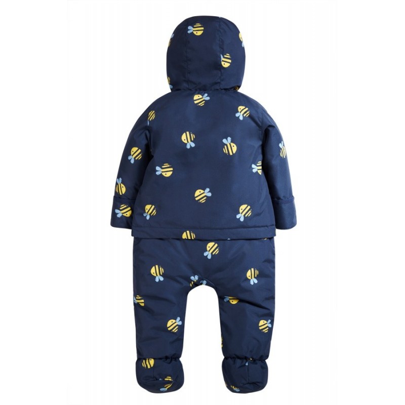 Süßer Schneenazug mit Bienen-Allover von frugi aus recyceltem Polyester. Der Anzug besteht aus zwei Teilen und kann durch Drückknöpfe separiert werden.