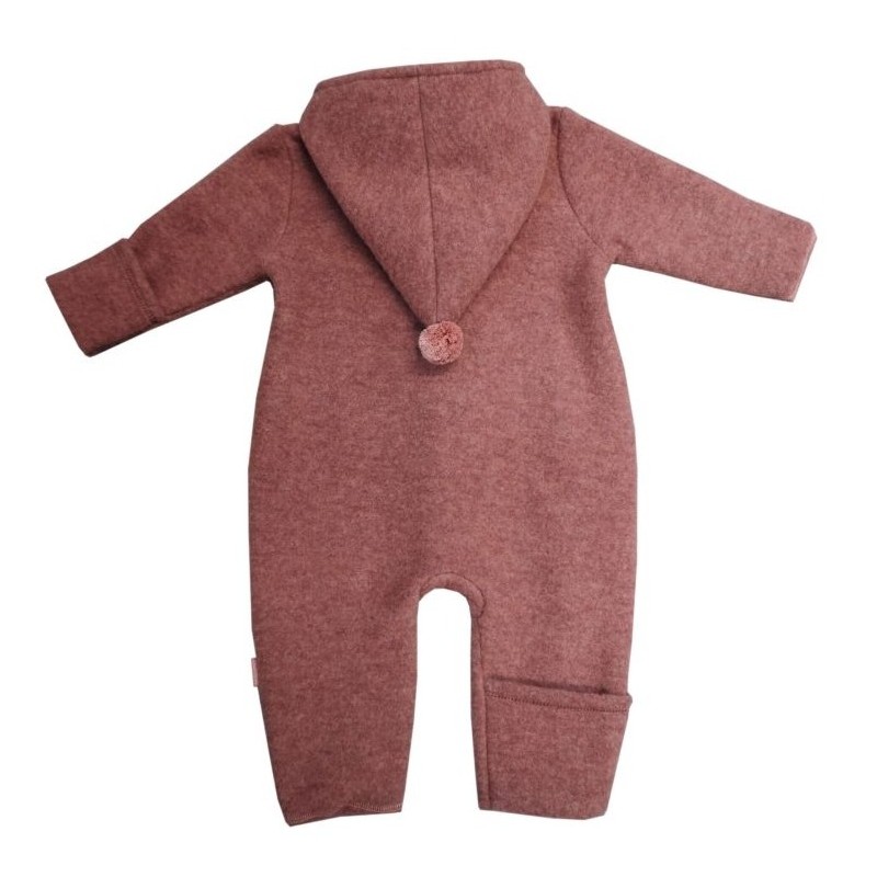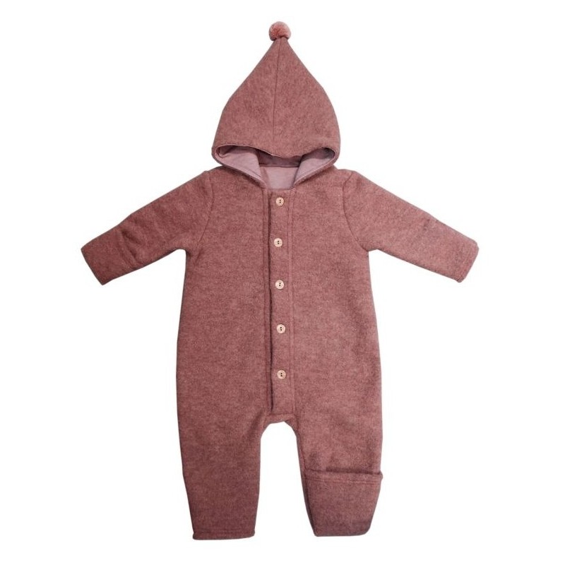 Der kuschelige Fleeceoverall ist mit einer durchgehenden Knopfleiste, sowie Fuß- und Beinumschlägen und einer Kapuze gefertigt.