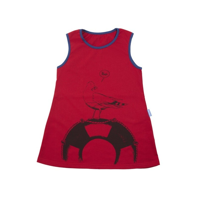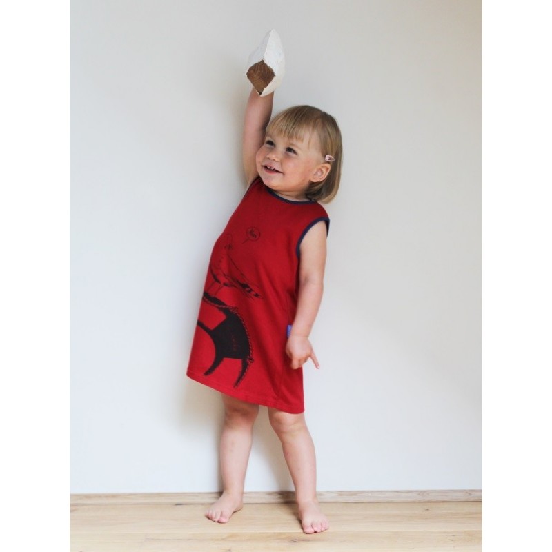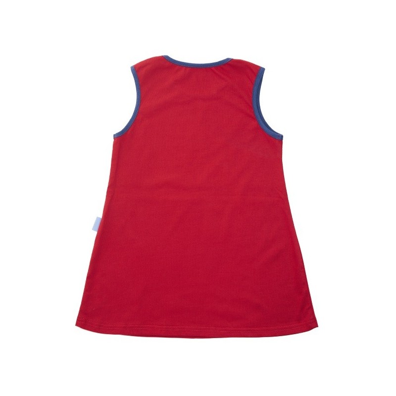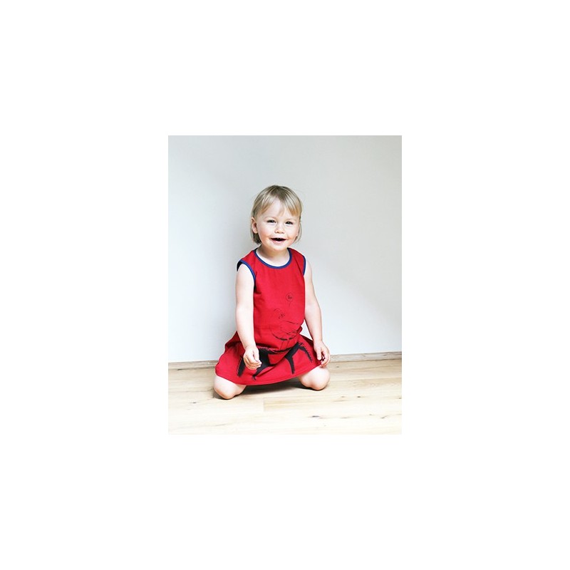 Das Kleid ist aus einem angenehmen Jersey Stoff. Die Armlöcher und das Halsloch sind mit der Kontrastfarbe blau eingefasst.