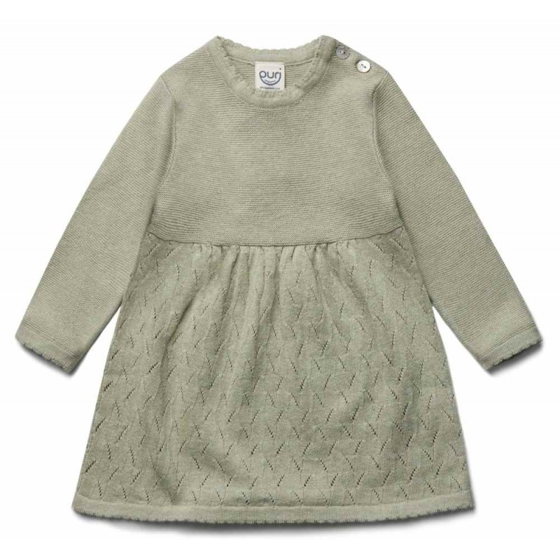Weiches Baby Kleid: Am Oberteil feiner Krausstrick und am Rock aufwendiger, blickdichter Ajourstrick. Mit 2 Perlmuttknöpfen am Halsausschnitt.