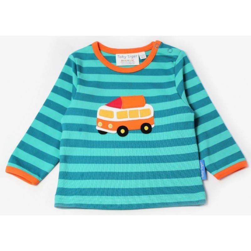 Das Shirt hat eine lustige Campingbus-Applikation.