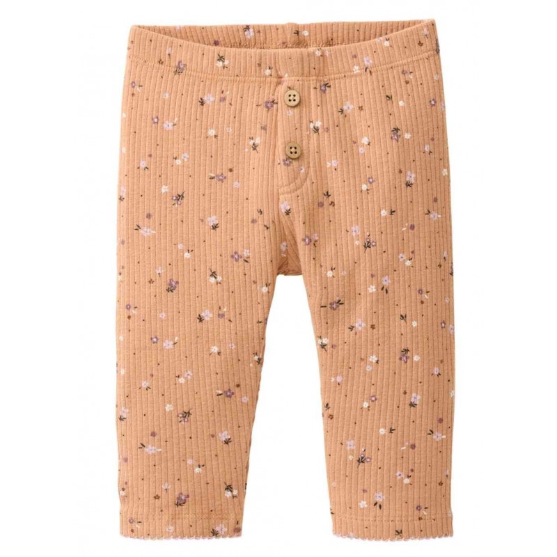 Süße Kinder Leggings von People Wear Organic mit Blümchen-Allover, Fake-Knopfleiste und Crochetkante an den Beinbündchen.