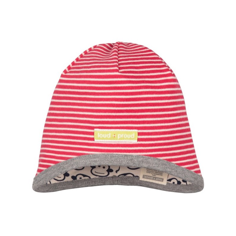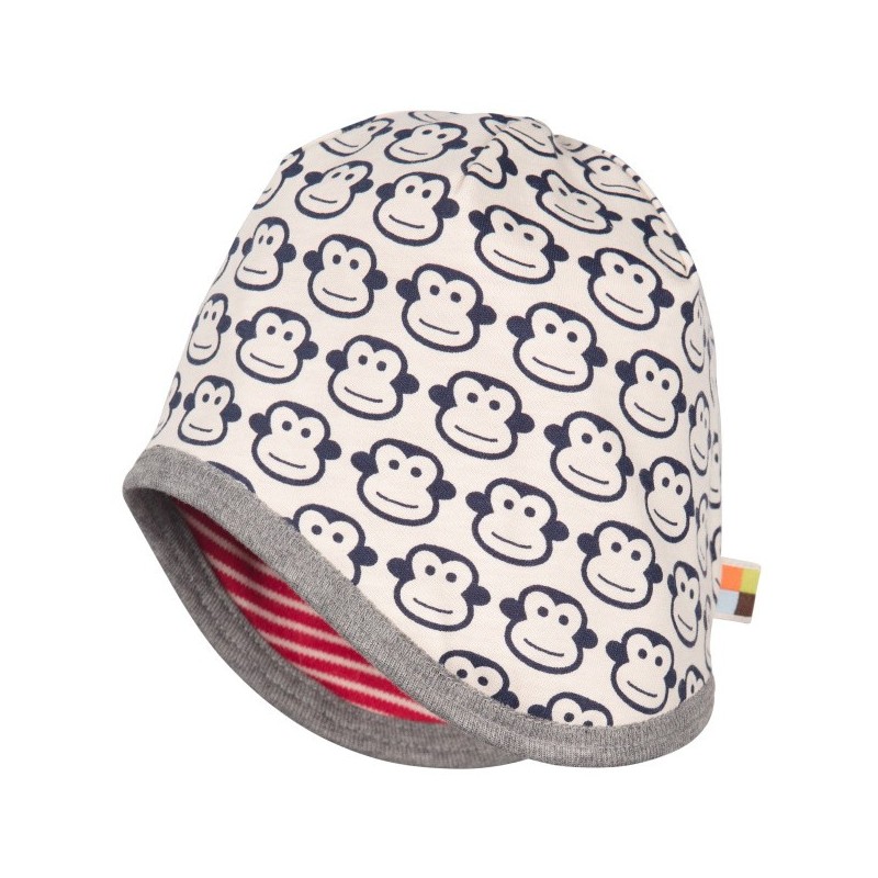 Die Mütze ist auf der einen Seite mit einem lustigen Affen-Allover verziert und auf der anderen Seite mit Streifen.