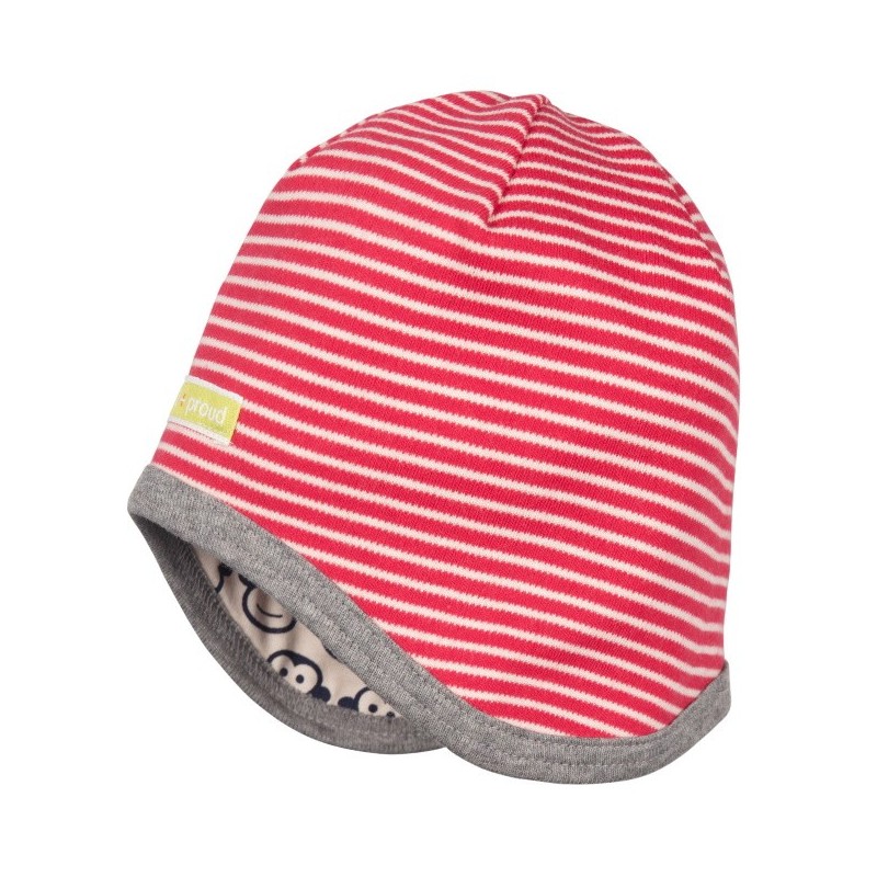 Die Mütze ist auf der einen Seite mit einem lustigen Affen-Allover verziert und auf der anderen Seite mit Streifen. Die Kanten sind mit einem kontrastfarbigen Einfassband abgesetzt.