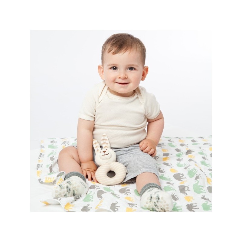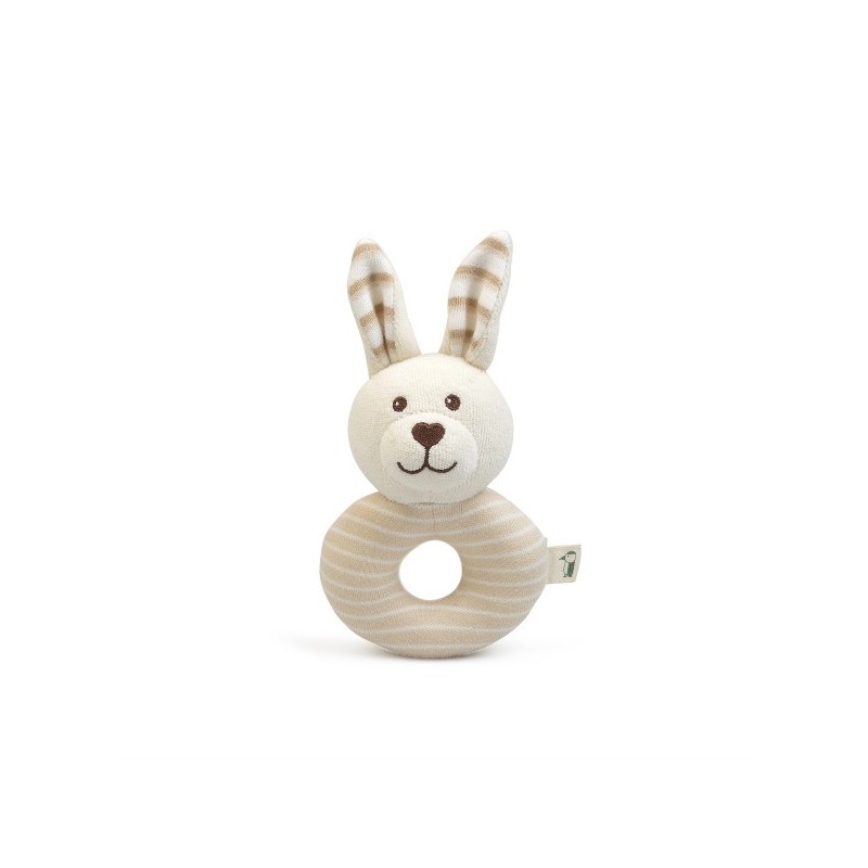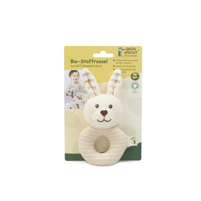 Unsere wunderbar weiche und plüschige Rassel in Hasenform ist ein optimaler Begleiter für Babys von Geburt an. Beim Bewegen erklingt ein Rasselgeräusch. Der kuschelige Greifling aus Plüsch eignet sich hervorragend zum Schmusen und Kuscheln. Unsere Stoffrassel ist GOTS-zertifiziert und aus 100 % Baumwolle aus kontrolliert biologischem Anbau hergestellt. Mit dieser Rassel kann das Baby auf spielerische Weise seine ersten Erfahrungen mit Bewegung, Tasten sowie Hören und Greifen machen. Babys nehmen Dinge gern in den Mund, um sie näher kennenzulernen. Das können sie mit dieser Babyrassel ohne weiteres tun. Die Bio-Baumwolle (kbA) wird streng schadstoffgeprüft. Die Rassel ist außerdem ein wunderschönes Geschenk zur Geburt.