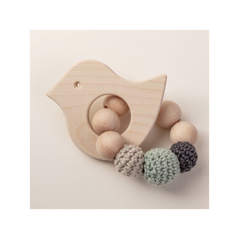 Süßer Baby Greifling von NoniKids Berlin. Der Anhänger wird in der Holzwerkstatt einer Einrichtung für Menschen mit Behinderung von Hand hergestellt bearbeitet und danach wird der Greifling in Berlin per Handarbeit fertiggestellt.