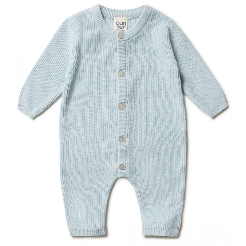 Feiner, weicher Baby Strampler in Perlfangstrick. Einfach anzuziehen durch die durchgehende Knopfleiste mit Permuttknöpfen.