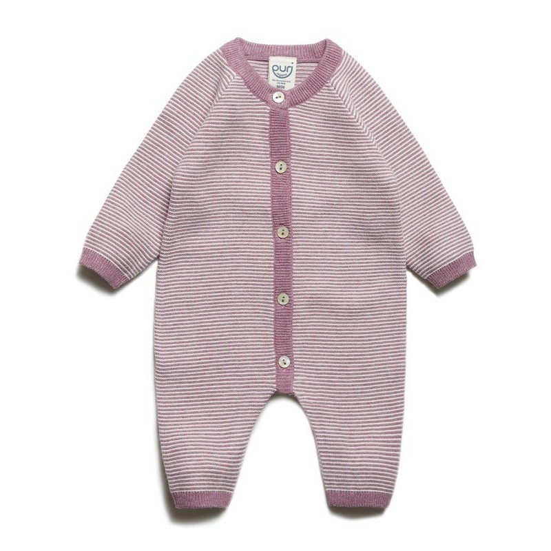 Feiner, weicher Baby Strampler in Krausstrick. Einfach anzuziehen durch Perlmuttknöpfe vorne und nickelfreie Druckknöpfe an den Innenbeinen.