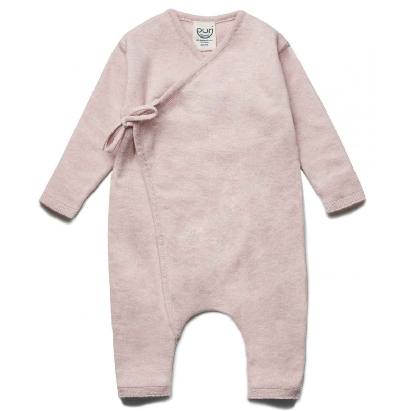 Feiner, weicher Baby Strampler in Doppelstrick. Einfach anzuziehen durch ein seitliches Bindeband. In der Innenseite durch einen Perlmuttknopf zu schliessen.
