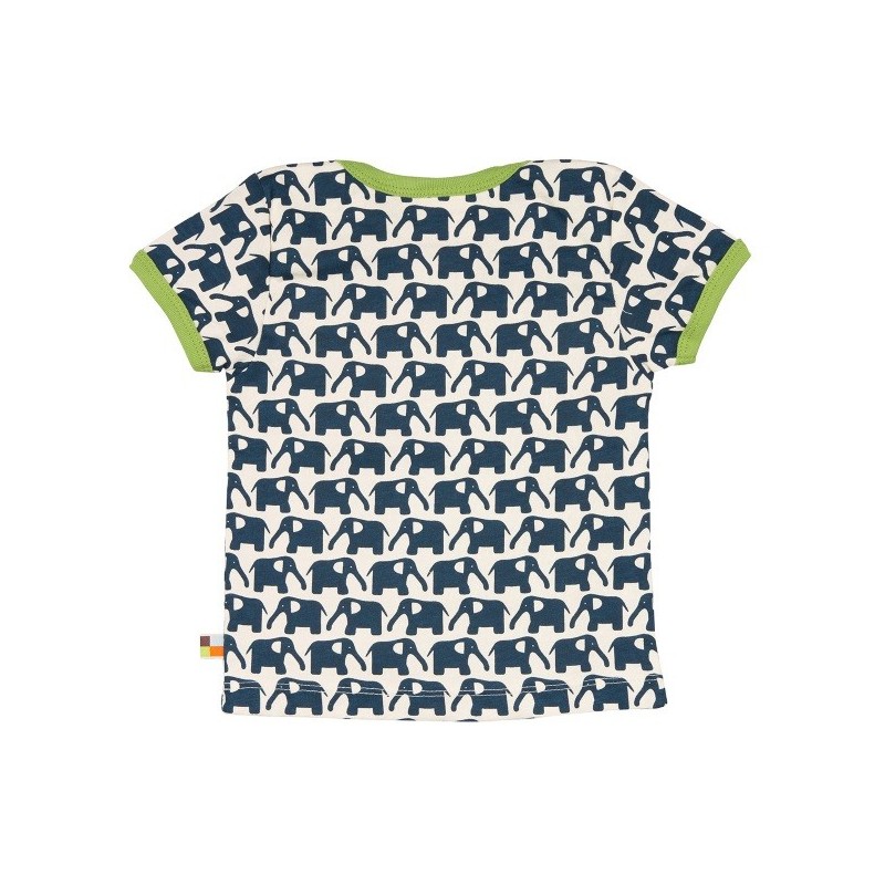 Das Shirt ist mit einem lustigen Elefanten-Allover verziert und die Kanten sind mit einem kontrastfarbigen Einfassband abgesetzt.