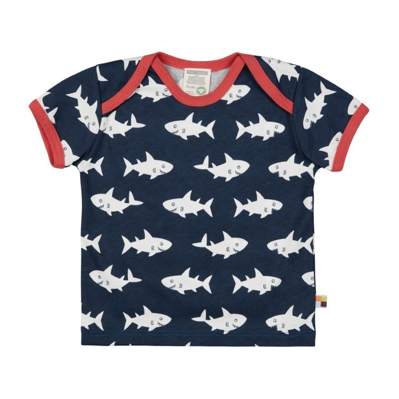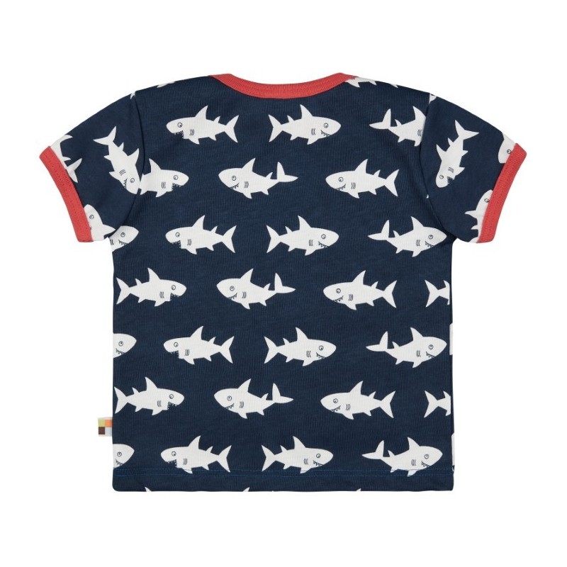 Das Shirt ist mit einem coolen Hai-Allover verziert und die Kanten sind mit einem kontrastfarbigen Einfassband abgesetzt.