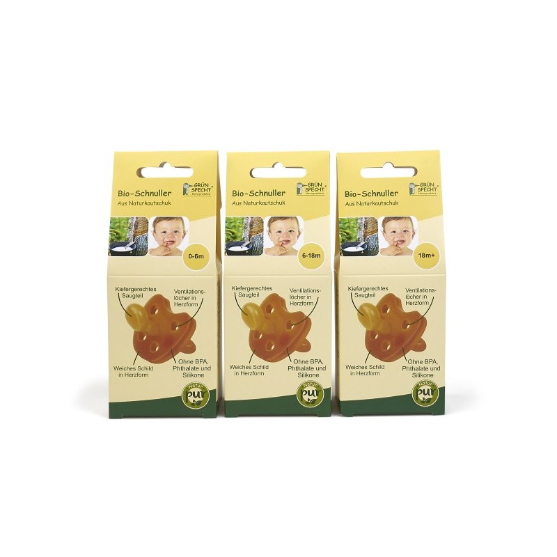 Der GRÜNSPECHT Bio-Schnuller ist in drei Größen erhältlich. Größe 1 ist für Babys von 0 bis 6 Monaten geeignet, Größe 2 für Babys/Kleinkinder von 6 bis 18 Monaten und Größe 3 für Kleinkinder ab 18 Monaten.