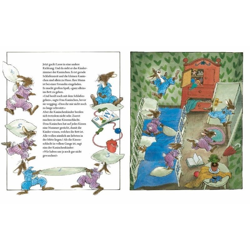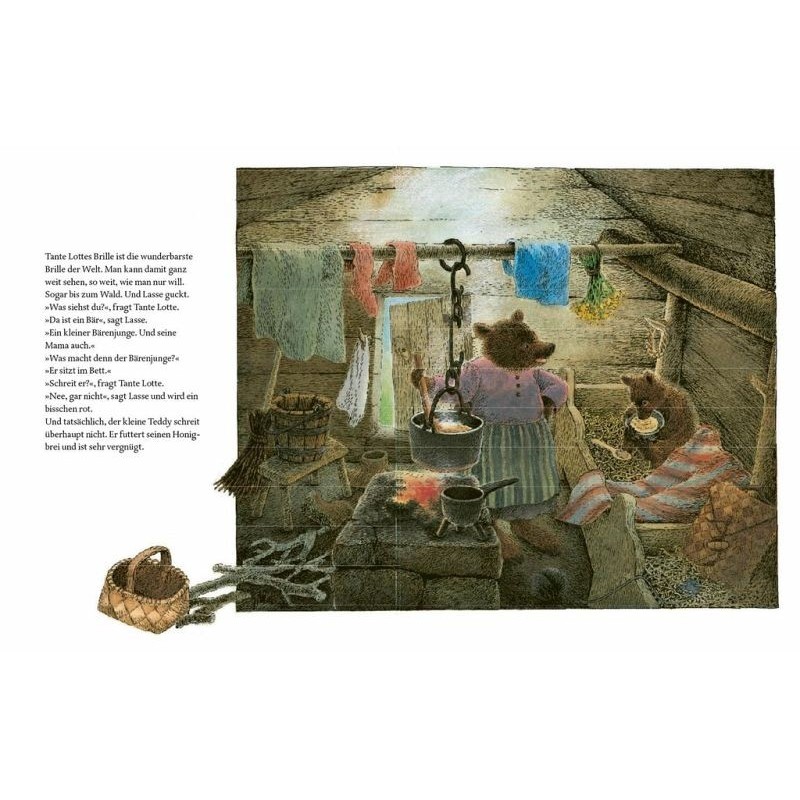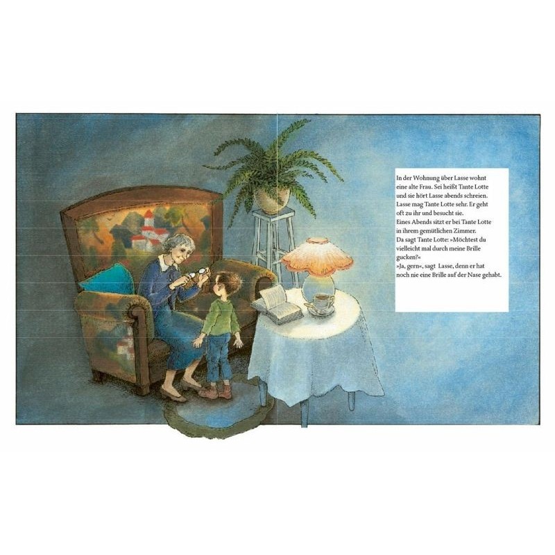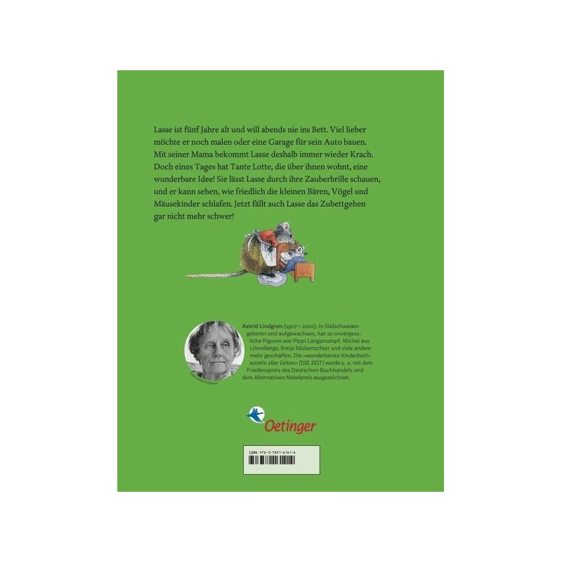 Lasse ist fünf Jahre alt und will abends nie ins Bett. Viel lieber möchte er noch malen oder eine Garage für sein Auto bauen. Mit seiner Mama bekommt Lasse deshalb immer wieder Krach. Doch eines Tages hat Tante Lotte, die über ihnen wohnt, eine wunderbare Idee! Sie lässt Lasse durch ihre Zauberbrille schauen und er kann sehen, wie friedlich die kleinen Bären, Vögel und Mäusekinder schlafen. Jetzt fällt auch Lasse das Zubettgehen gar nicht mehr schwer!