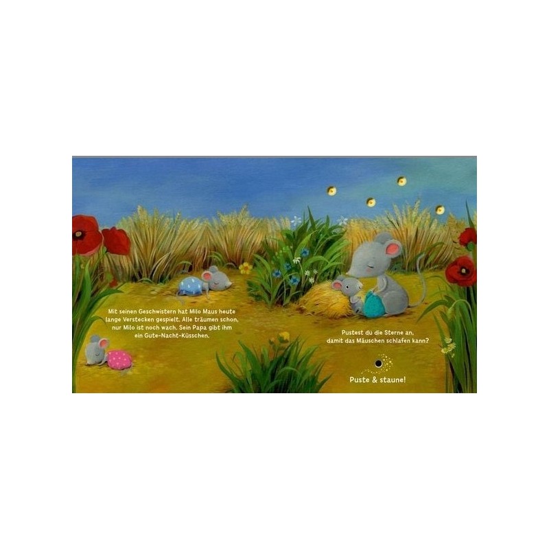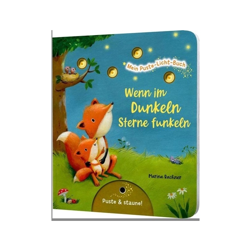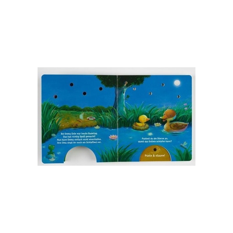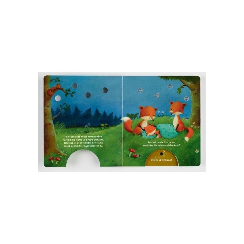 Denn Emma Ente, Fine Fuchs und Benni Bär können einfach nicht einschlafen. Jetzt einmal pusten und schon beginnen die Sterne am Himmel zu leuchten. So können die Tierkinder beruhigt die Äuglein schließen. Ein zauberhaftes Gute-Nacht-Buch mit Puste-Licht!