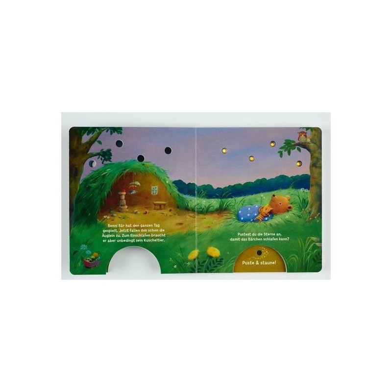Dieses Pappebuch für Kinder ab 18 Monaten begeistert durch seinen magischen Mitmach-Effekt: Einmal pusten und die Lichter beginnen zu leuchten! So So können schon die Allerkleinsten den müden kleinen Tieren beim Einschlafen helfen.
