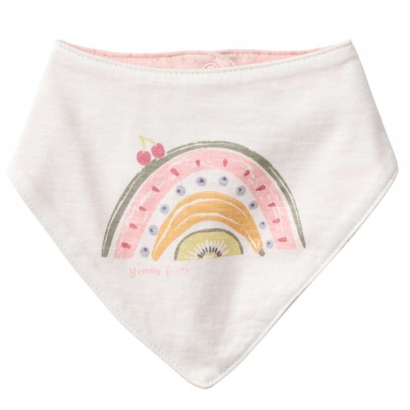 Süßes Baby Tuch mit fruchtigem Regenbogen-Druck und Punkten von People Wear Organic zum Wenden. Das Tuch ist mit einem Druckknopf zu schliessen.