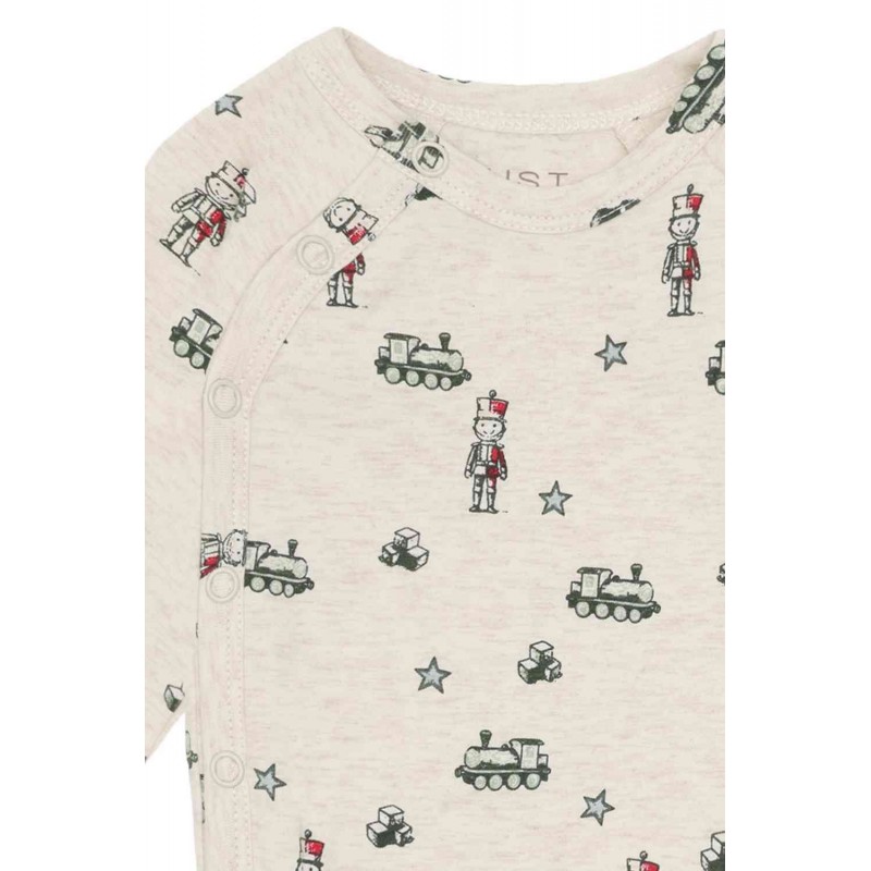 Süßer Baby Wickelbody mit Zinnsoldaten-Allover und Druckknöpfen im Schrittbereich.