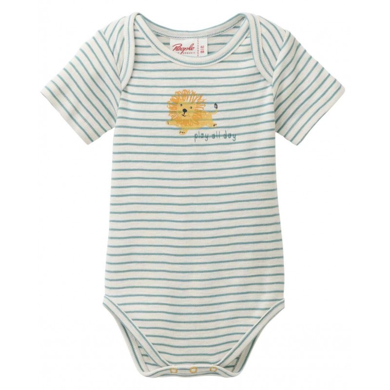 Weicher Body von People Wear Organic mit Löwen-Druck. Der Body ist mit Druckknöpfe zu öffnen bzw. schließen um das Wickeln zu erleichtern.
