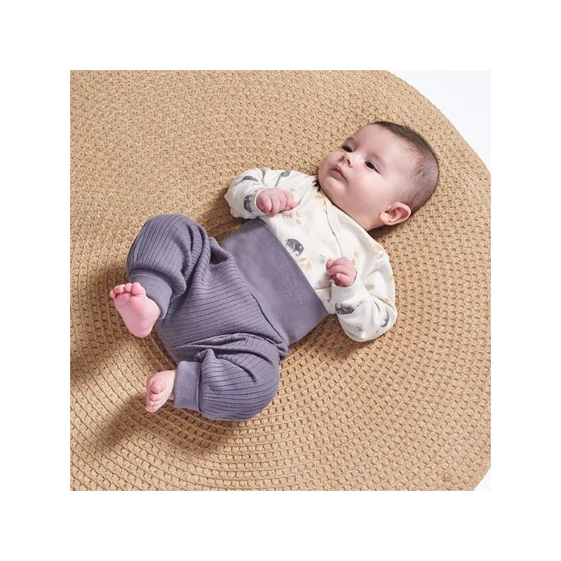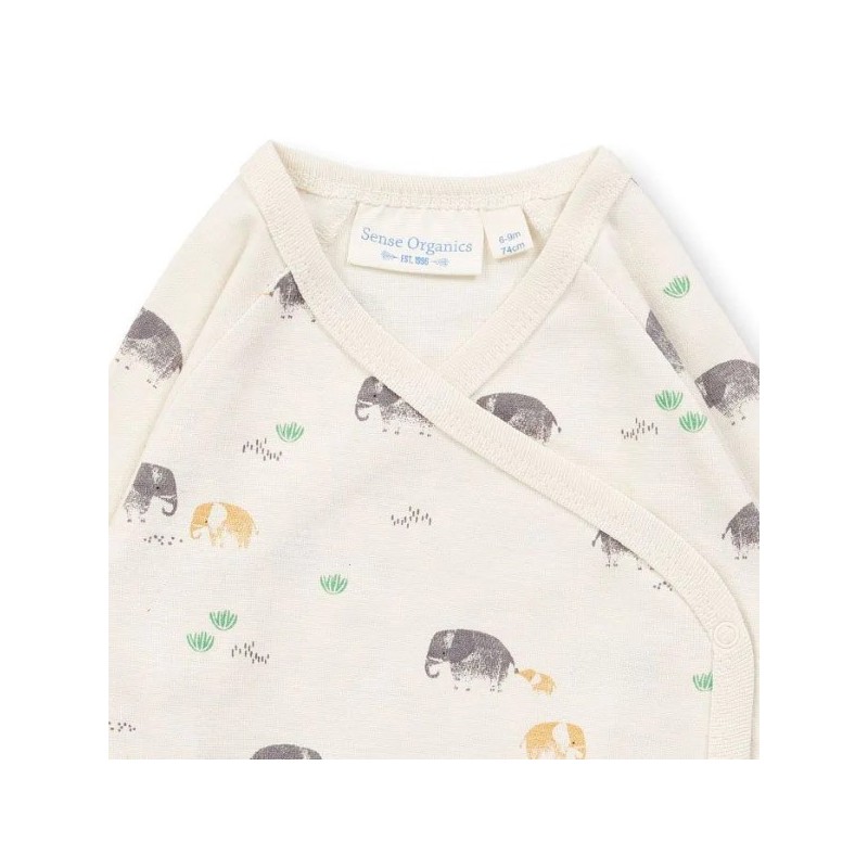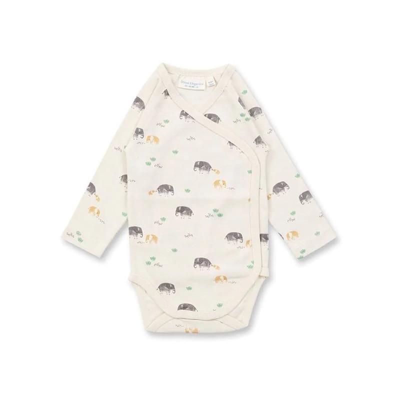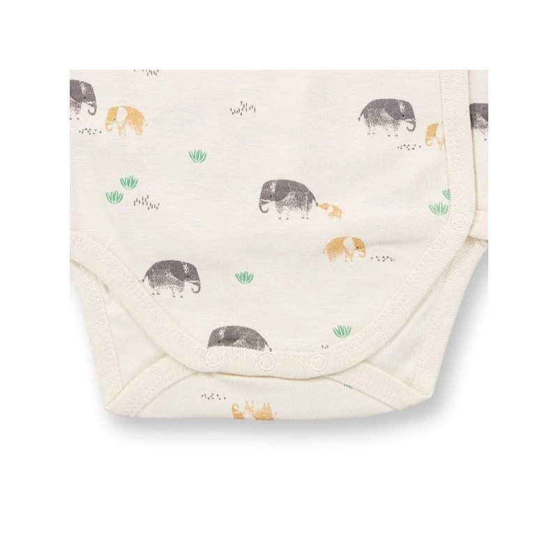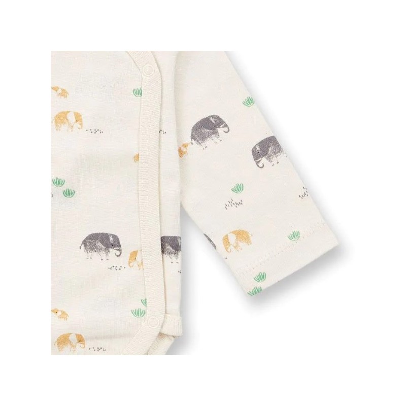 Süßer Babybody mit Elefanten-Allover, amerikanischem Ausschnitt und Druckknöpfen im Schrittbereich.