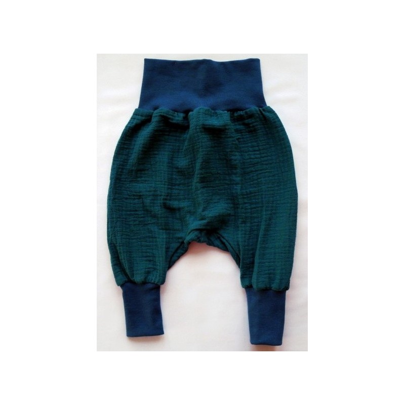 Diese Musselinhose wird ihr Kind lieben - durch die breiten Bein- und Bauchbündchen "wächst" die Hose um ein/zwei Größen mit.