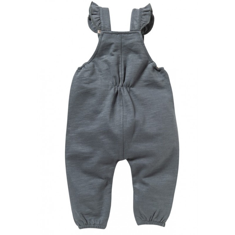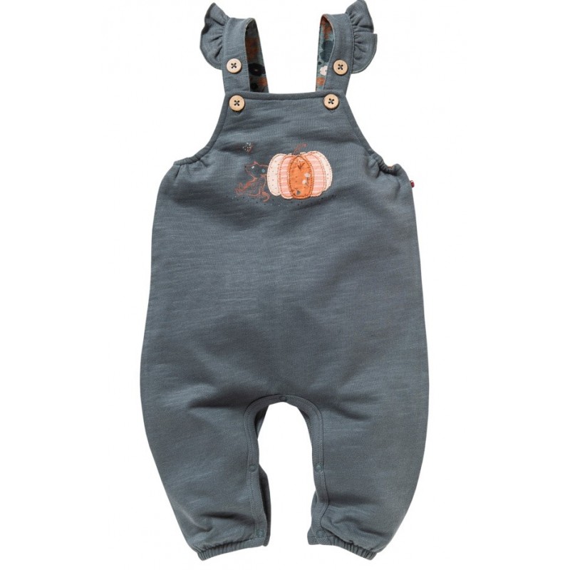Coole Baby Latzhose aus Sweat von People Wear Organic mit Maus-Druck und Kürbis-Applikation.