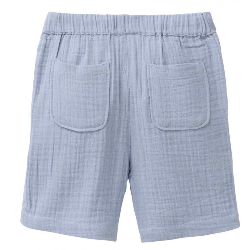 Coole Kinder Musselinshorts von People Wear Organic mit 2 seitlichen Eingrifftaschen, zwei hinteren aufgesetzten Tasche und aufgesetzer (unechter) Knopfleiste sowie Bindeband am Bündchen.