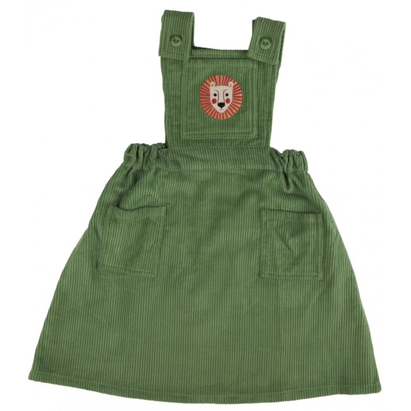 Süßes Latzkleid aus weichem Cord mit aufgesetzten Taschen (an den Seiten und vorne am Latz) und einer liebevoll gestalteten Löwen-Stickerei.
