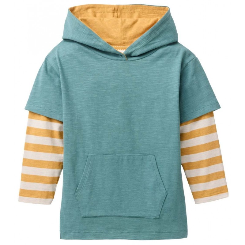 Cooles Kinder Shirt im Doppellayer-Stil mit geringelten Ärmeln, Känguru-Tasche und Kapuze von People Wear Organic.